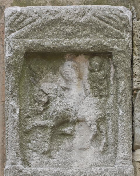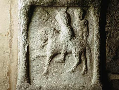 - Eingeschriebener Giebel mit Gorgoneion, auf den Schrägen Delphine. Im Hauptbild zwischen Säulen Reiter (Soldat) mit vexillum, rechts oben kleiner Calo.