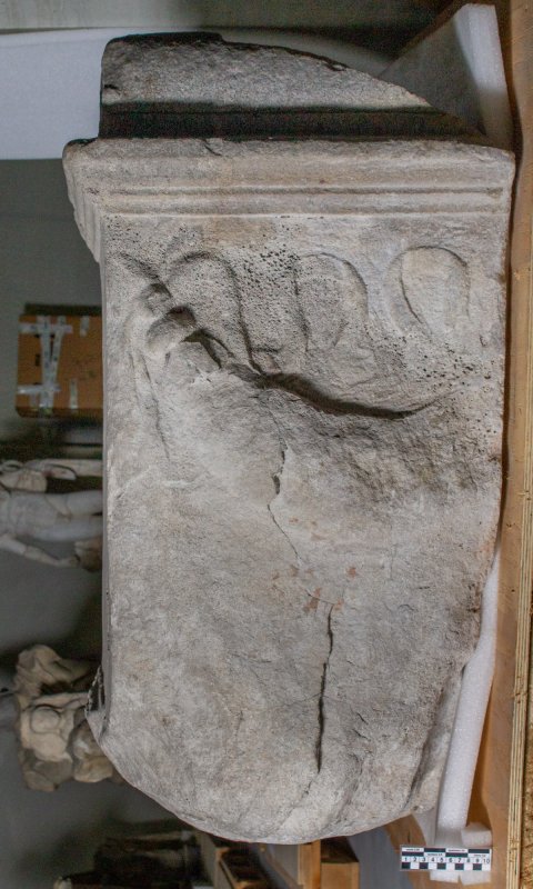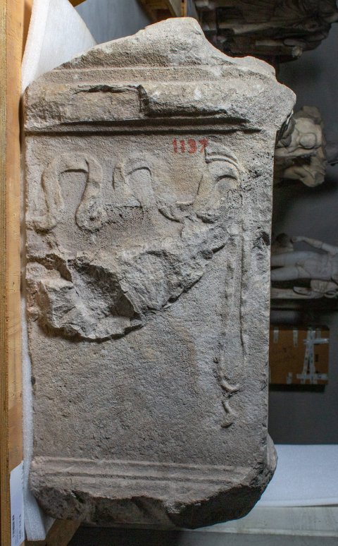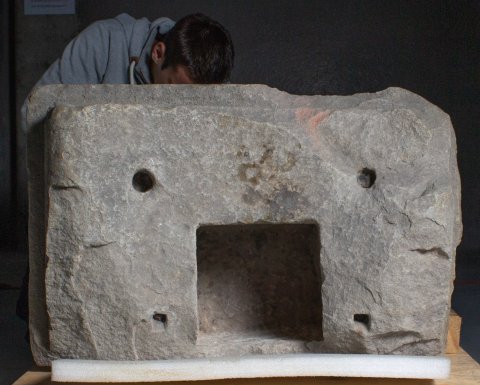 - stark bestoßen, Unterseite u. pulvini tlw. abgebr., in der Oberseite 4 Dübellöcher um die eckige Aushöhlung für die Aschenurne