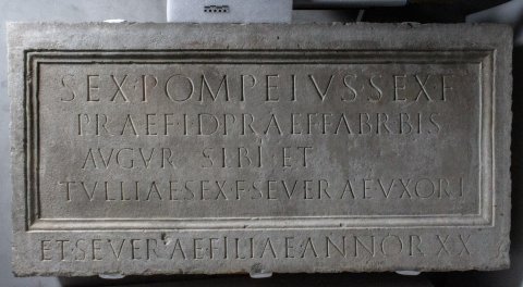 - Sex(tus) Pompeius Sex(ti) f(ilius) / praef(ectus) i(ure) d(icundo) praef(ectus) fabr(um) bis / augur sibi et / Tulliae Sex(ti) f(iliae) Severae uxori // et Severae filiae annor(um) XX