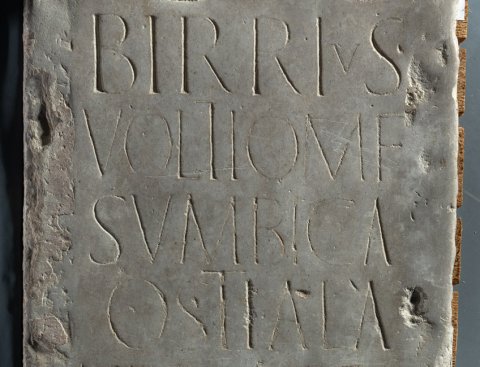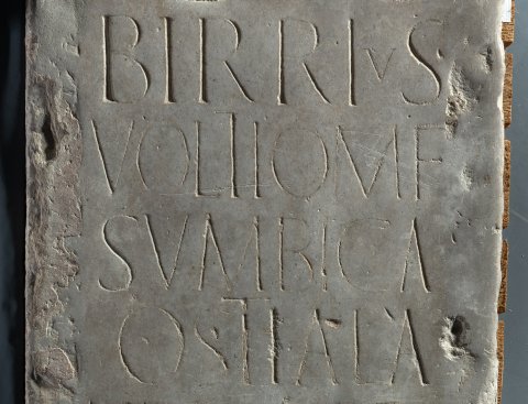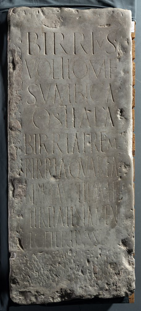 - Birrius / Voltiom(ni) f(ilius) / Sumbica / Ostiala / Birria Frem(antia) / Birria Quarta / Birria Voltiom(ni) f(ilia) / Tertia testamen/to fieri iussit