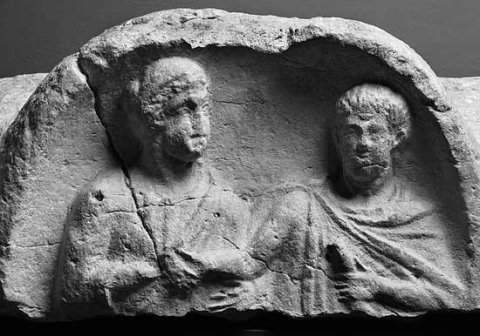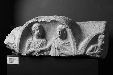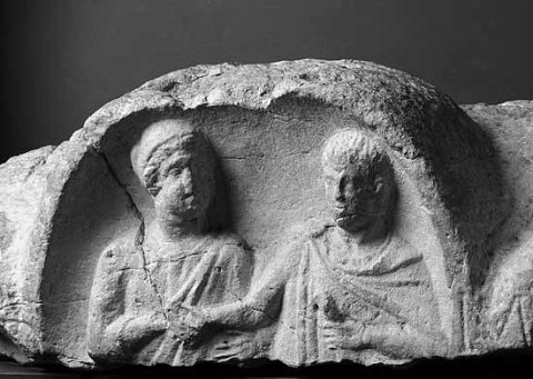 310 Aschenkistendeckel mit Grabrelief eines Ehepaares