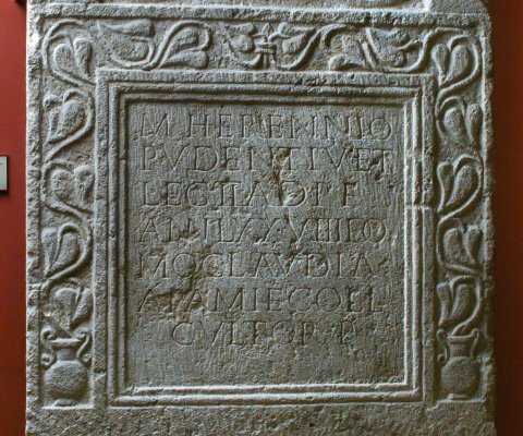 - M(arco) Herennio / Pudenti vet(erano) / leg(ionis) II Ad(iutricis) P(iae) F(idelis) / ann(orum) LXXVIII do/mo Claudia / Apamie coll(egium) / cultor(um) p(osuit)