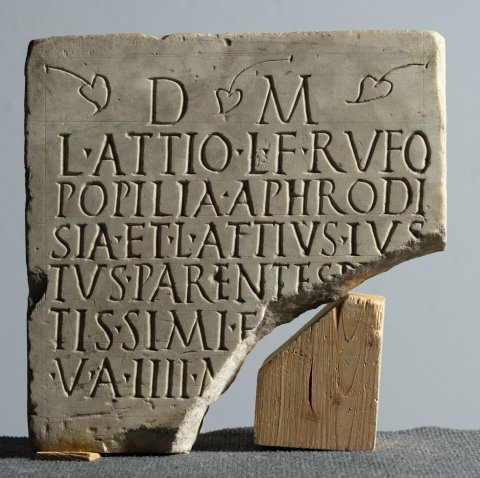 - D(is) M(anibus) / L(ucio) Attio L(uci) f(ilio) Rufo / Popilia Aphrodi/sia et L(ucius) Attius Ius/tus parentes pi[en]/tissimi f(ilio) [---] / v(ixit) a(nnos) IIII m(enses) [---]
