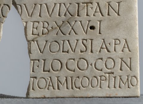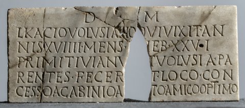 - D(is) M(anibus) / L(ucio) Kacio Volusiano qui vixit an/nis XVIIII mens(e) I dieb(us) XXVI / Primitivianus et Volusia pa/rentes fecerunt loco con/cesso a Gabinio Adiecto amico optimo