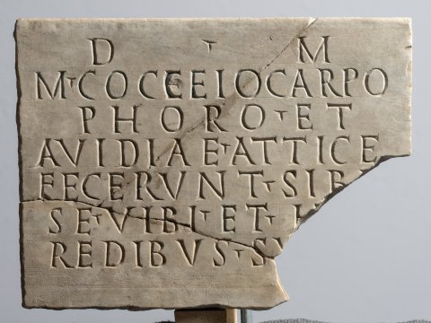 - D(is) M(anibus) / M(arco) Cocceio Carpo/phoro et / Avidiae Attice / fecerunt sibi / se vibi(!) et h[e] / redibus su[is ---]