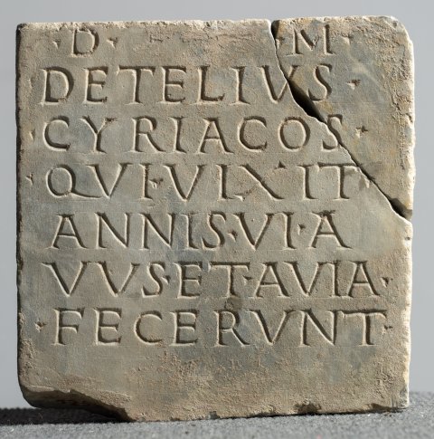 - D(is) M(anibus) / Detelius / Cyriacos(!) / qui vixit / annis VI a/vus et avia / fecerunt