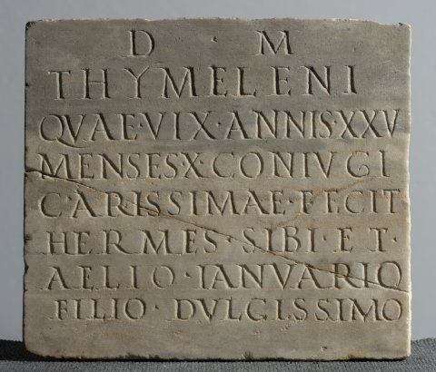 - D(is) M(anibus) / Thymeleni / quae vix(it) annis XXV / menses(!) X coniugi / carissimae fecit / Hermes sibi et / Aelio Ianuario / filio dulcissimo