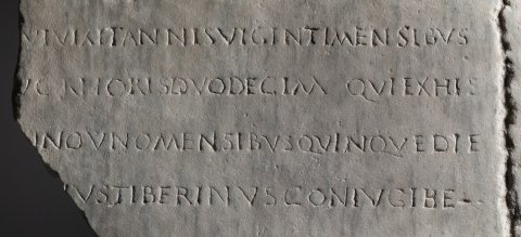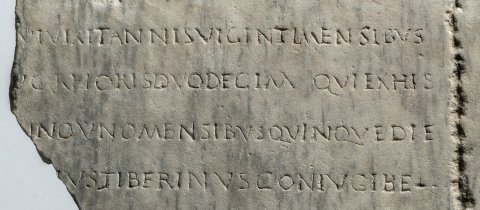 - [Q]ui(!) vixit annis viginti mensibus / [quatt]uor horis duodecim(is) qui ex his / [mecum a]nno uno mensibus quinque die(bus) / [---]ius Tiberinus coniugi be(ne merenti)