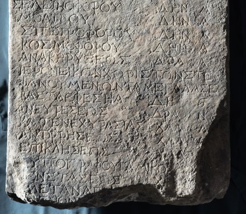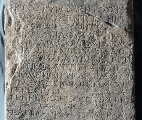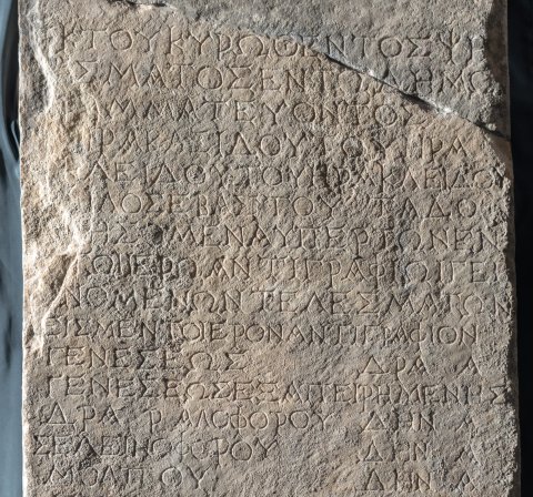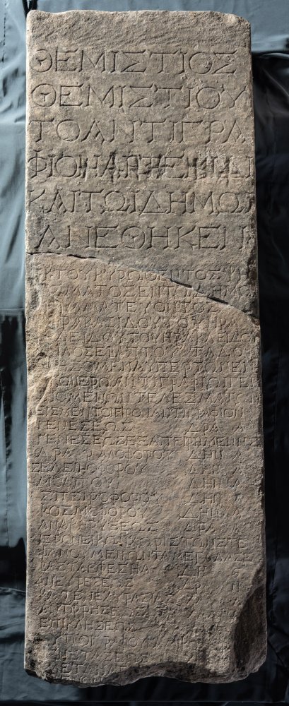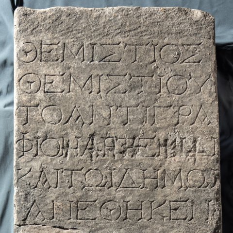 - griechisch: Θεμίστιος / Θεμιστίου / τὸ ἀντιγρα/φῖον Ἀρτέμιδι / καὶ τῶι δήμωι / ἀνέθηκεν. / ἐκ τοῦ κυρωθέντος ψη/[φί]σματος ἐν τῷ δήμῷ, / [γ]ρ[α]μματεύοντος / Ἡρακλείδου τοῦ Ἡρα/κλείδου τοῦ Ἡρακλείδου / φιλοσεβάστου, τὰ δο/[θ]ησόμενα ὑπὲρ τῶν ἐν / τῷ ἀντιγραφίωι γει/νομένων τελεσμάτων· / εἰς μὲν τὸ ἱερὸν ἀντιγραφῖον· / γενέσεως vacat δρα(χμὴν) αʹ· / γενέσεως ἐξ ἀπειρημένης / δρα(χμὰς) ρʹ· ἁλοφόρου δην(άριον) αʹ· / σελεινοφόρου vacat δην(άριον) αʹ· / μολποῦ vacat δην(άριον) αʹ· / σπειροφόρου vacat δην(άριον) αʹ· / κοσμοφόρου vacat δην(άριον) αʹ· / ἀνακηρύξεως vacat δρα(χμὴν) αʹ· / ἱερονεικῶν χωρὶς τῶν στε/φανουμένων τὰ μεγάλα Σε/βαστὰ Ἐφέσηα vacat δη(νάρια) ξʹ· / ἀνευρέσεως vacat δρα(χμὰς) νʹ· / κατενεχυρασίας vacat χαλ(κοῦς) αʹ· / ἀντιρρήσεως vacat χαλ(κοῦς) αʹ· / ἐπικλήσεως vacat χαλ(κοῦς) [αʹ?·] / [τ]υπογράφου γαμικο[ῦ δ]ρα(χμὰς?) [․ʹ·] / ἐνστάσεως vacat χ[αλ(κοῦς) αʹ?·] / μεταναγ[ραφῆς? —] / [․]ενοντ̣[—]