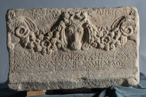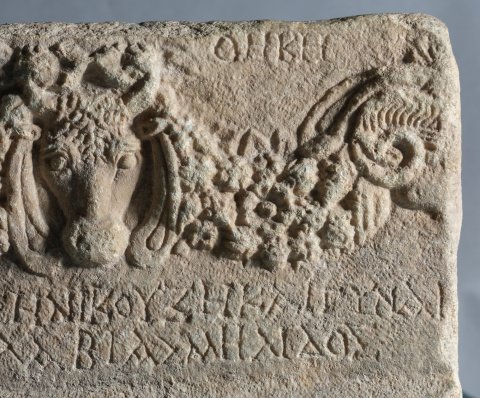 - griechisch: ἡ ὀστοθήκη / ἐστὶν // Φλαβίου Ἐσηνικοῦ —— ζῇ —— καὶ γυναι/κὸς αὐτοῦ Φλαβίας Μηλίδος