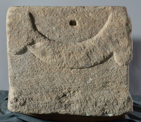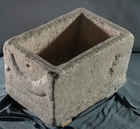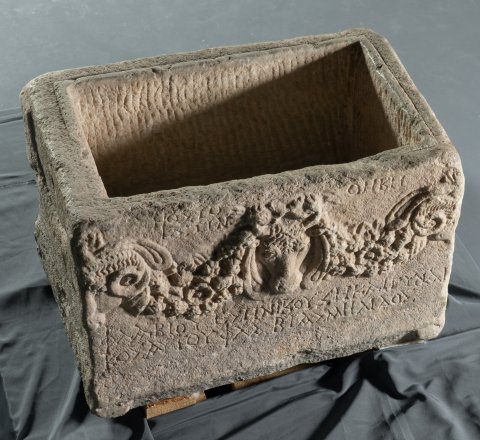 - Kasten mit Girlanden, die an einem Stierkopf in der Mitte und zwei Widderköpfen an den Ecken aufgehängt sind. Girlanden auf den Nebenseiten nicht fertig ausgeführt.