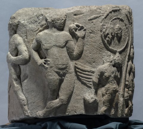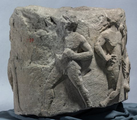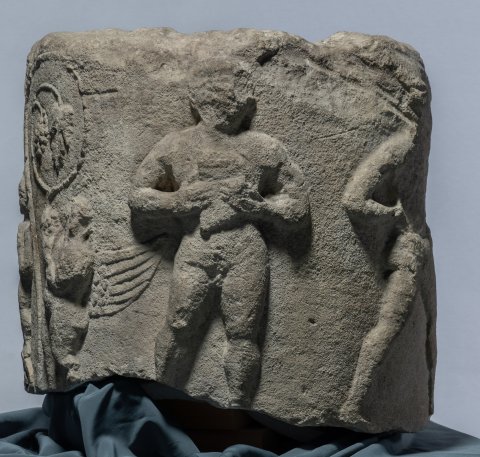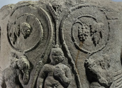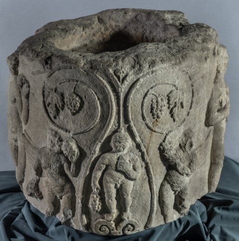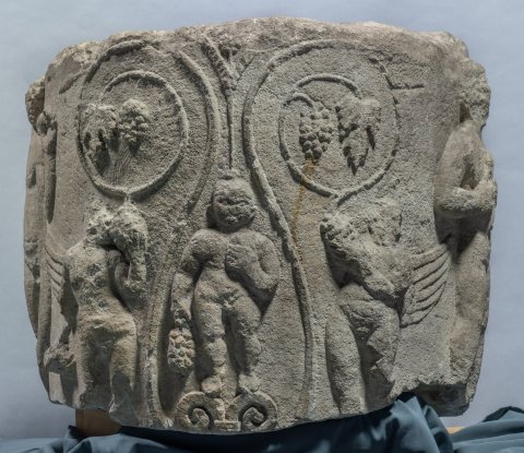 - Auf einer Doppelvolute (Kapitell ?) zwischen Weinranken stehender nackter Knabe mit Traube in der Rechten, in der auf der Brust liegenden Linken Frucht (?). Über ihm Pflanzenstängel mit Blattkelch und Blüte. Rechts und links stehende geflügelte Genien (Erot ?), die nach herabhängenden Trauben greifen. Nach rechts hin folgen ein stehender nackter Jüngling mit Syrinx (?) in beiden Händen und zwei aufeinander zu laufende nackte männliche Figuren (stark zerstört). Der folgende mit gekreuzten Beinen stehende Jüngling ist nach rechts zum Mittelmotiv gewandt und hält in der erhobenen Linken eine Frucht.