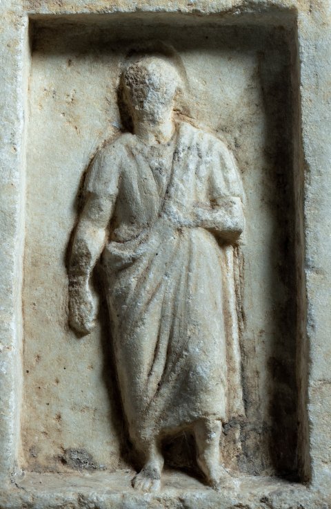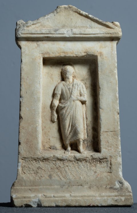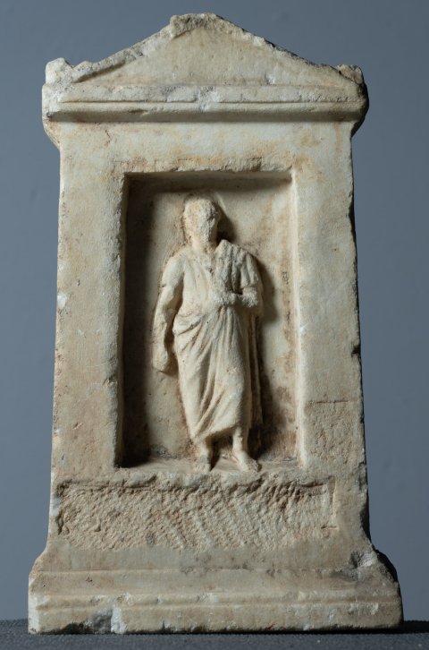 - Stele in Aediculaform mit Giebel und Akroteren, rahmenlose Rechtecknische, darin stehender Mann in Chiton und Mantel, in der gesenkten Rechten Attribut.