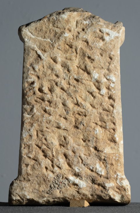 - verrieben, bestoßen, Inschrift eradiert, Akrotere abgebr.
