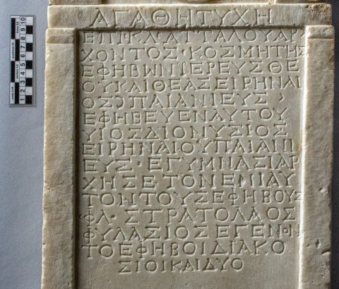 χοντος · κοσμητὴς / ἐφήβων ἱερεὺς Θε/οῦ καὶ Θεᾶς Εἰρηναῖ/ος Ͻ Παιανιεύς / ἐφήβευεν αὐτοῦ / υἱὸς Διονύσιος / Εἰρηναίου Παιανι/εύς · ἐγυμνασιάρ/
