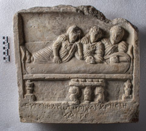 - Totenmahl mit drei Personen auf einer Kline. Zwei Frauen, ein bärtiger Mann; er und die mittlere Frau halten Becher in der Linken, die linke Frau legt die rechte Hand auf eine Traube (?). Vorn Tischchen mit Löwenprotomen, auf der Platte Gefäße.