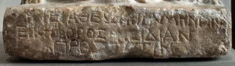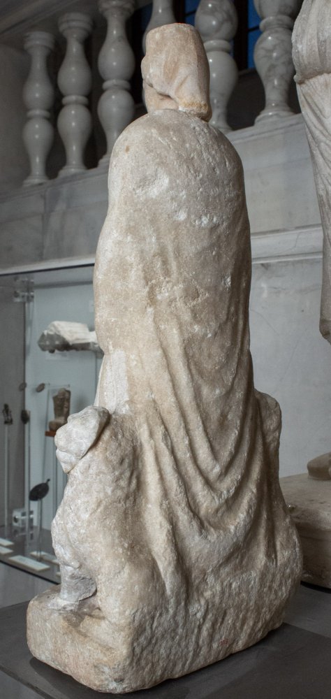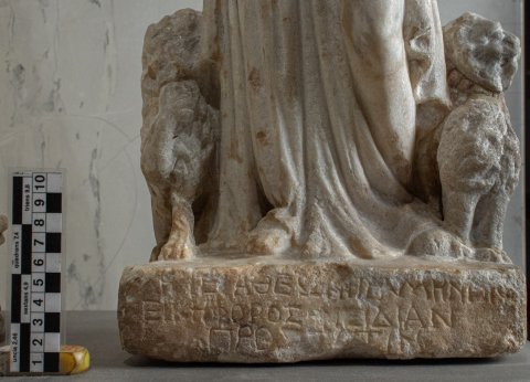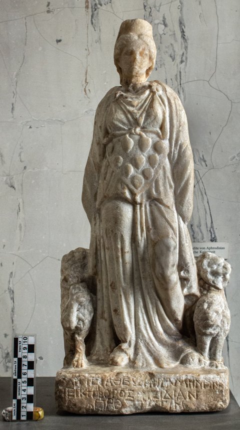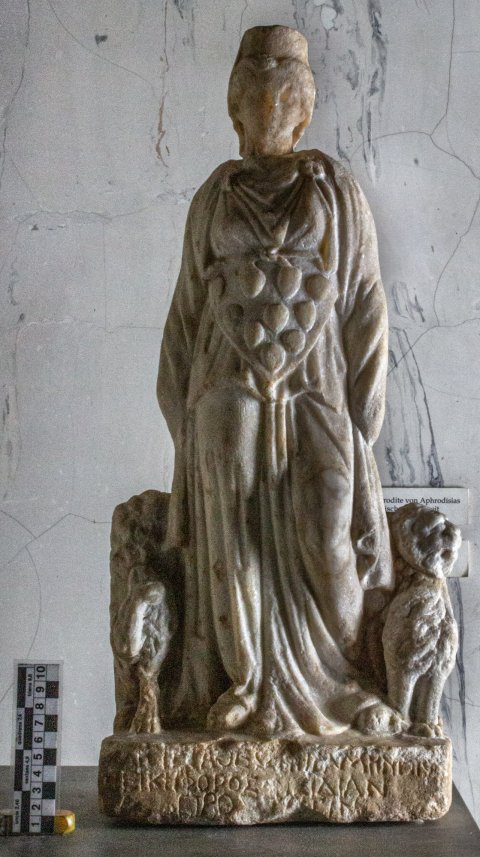 - Mythische Figur: stehende, von zwei hockenden Löwen flankierte Kybele mit Polos, Chiton und Mantel, am Gürtel befestigter Schurz mit zehn ovoiden Früchten (?). Inschrift auf dem Sockel.