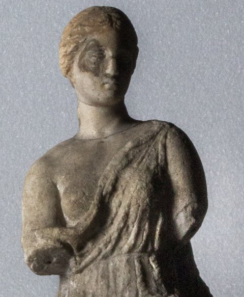 - bestoßen, Kopf mit antiken Teilen ergänzt, rechtes Knie ergänzt, Unterarme fehlen, Inschrift gefälscht