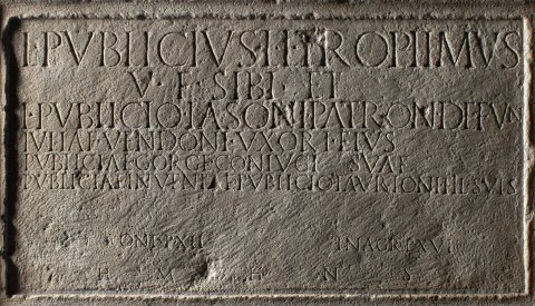 - L(ucius) Publicius L(uci) l(ibertus) Trophimus / v(ivus) f(ecit) sibi et / L(ucio) Publicio Iasoni patron(o) defun(cto) / Iuliae Vendoni uxori eius / Publiciae Gorge coniugi suae / Publiciae Inventae Publicio Taurioni fil(iis) suis / in fr(onte) p(edes) XII in ag(ro) p(edes) XVI / h(oc) m(onumentum) h(eredem) n(on) s(equetur)