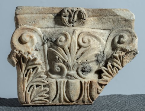 - Kompositkapitell mit Akanthusblättern an den Seiten, unten Eierstab, darüber Palmetten-Voluten-Motiv. Auf dem Abacus Medaillon mit Kelchblüte.