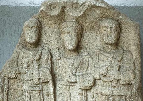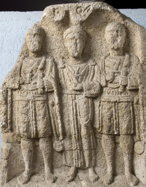 - Familie : unter Doppelbogen drei Ganzfiguren. Links und rechts Mann (Soldat): bärtig, kurze Ärmeltunica, Gürtel mit Rechteckschnalle, Sagum, Rosetten- bzw. Scheibenfibel, Hosen, in der Linken Rolle (volumen). Waffen: Schwertgurt (Balteus), Langschwert (Spatha) in Scheide mit Dosenortband. In der Mitte einheimische Frau: Haube, Unter- und Obergewand mit Gürtel, Fibeln, Brustschmuck, in der Linken Frucht.