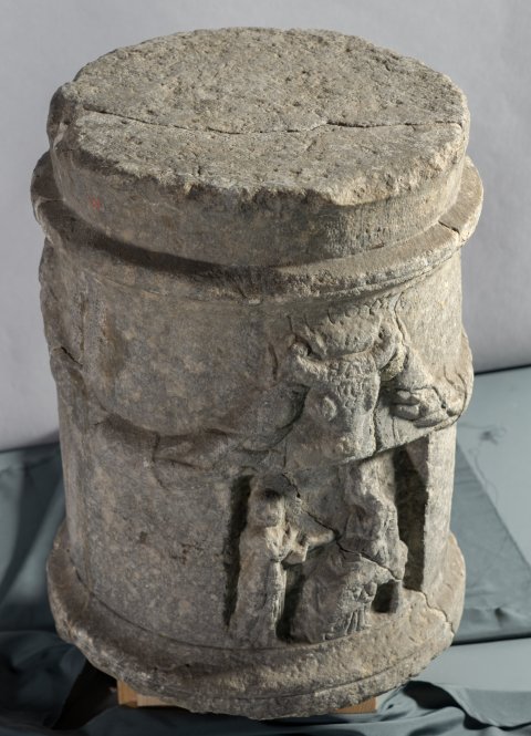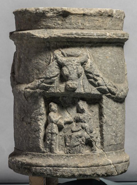 - Rundaltar mit Blattgirlande an Stierköpfen, unter einem der Köpfe rechteckige Nische mit sitzender Frau und vor ihr stehendem Mädchen (Dienerin ?).