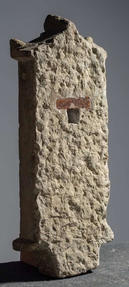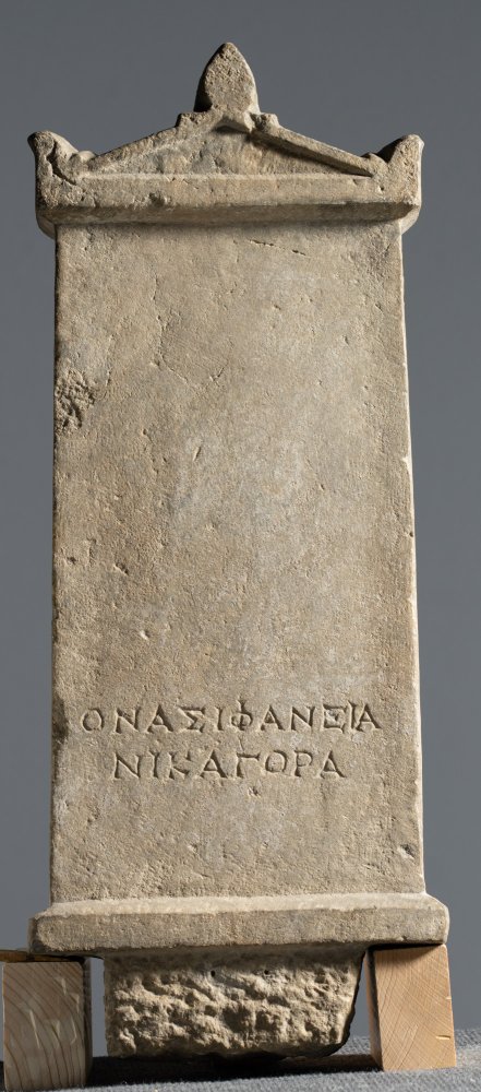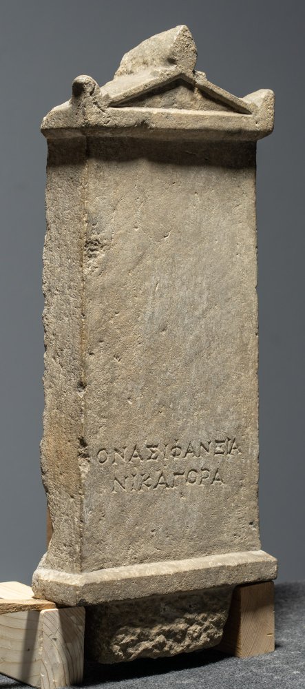 - Giebel mit Akroteren, rahmenloser Stelenschaft (mit gemalter Sitzfigur ?)