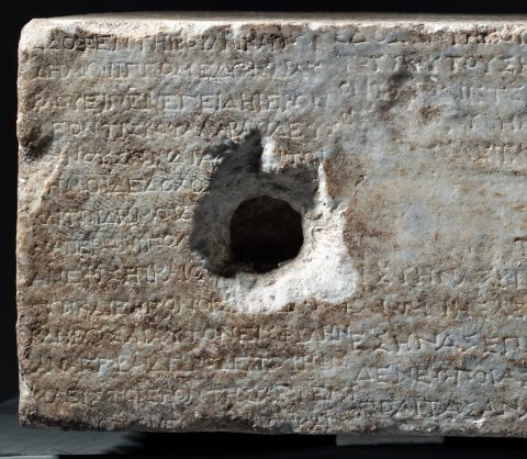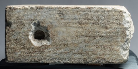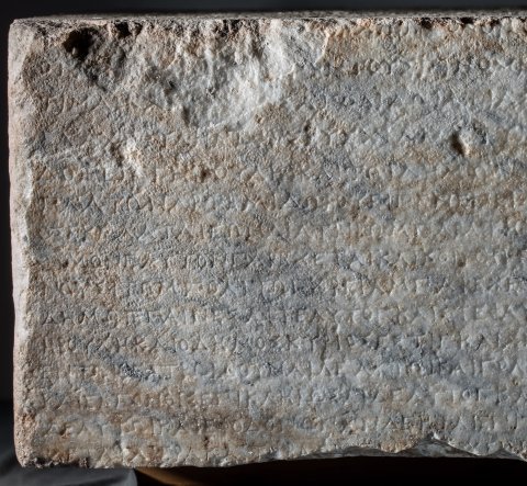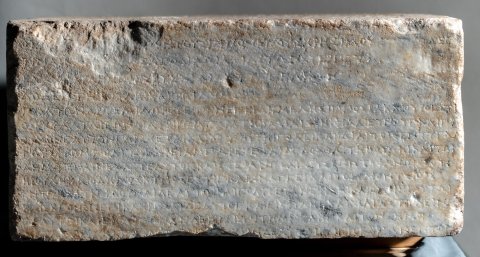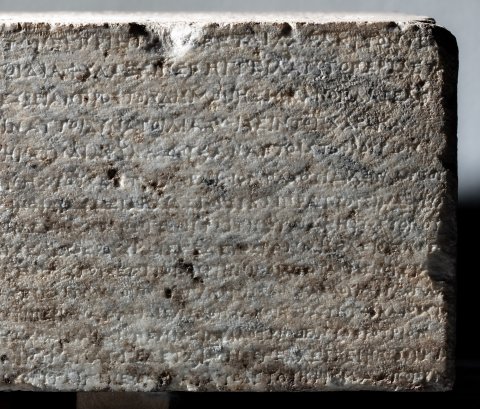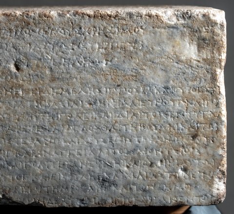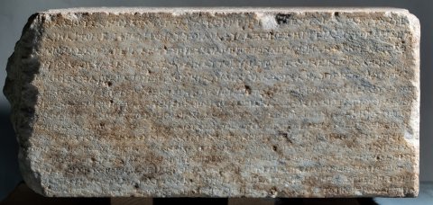 - griechisch. Vs: ἔ̣δοξεν τῆι βουλῆι καὶ τῶι δήμωι·/ Πλάτων Ἀρτεμιδώρου εἶπεν· ἐπειδὴ Μελήσιππος Βακχίου Βοιώτι/ος ἐκ Πλαταιέων διατρίβωμ παρὰ τῆι βασιλίσσηι Φίλαι εὔνουγ καὶ πρό/θυμον ἑαυτὸν παρέχεται καὶ κοινῆι τῆι πόλει καὶ ἰδίαι τοῖς ἐντυγχά/νουσι τῶμ πολιτῶγ χρείαμ παρέχεται / δεδόχθαι τῆι βουλῆι καὶ τῶι / δήμωι· ἐπαινέσαι τε αὐτὸγ καὶ στεφανῶσαι χρυσέωι στεφάνωι, ὅσου / ἡ βουλὴ καὶ ὁ δῆμος κύριός ἐστιγ καὶ ἀναγγεῖλαι τοῖς Διονυσίοις / ἐν τῶι θεάτρωι· δοῦναι δὲ αὐτῶι καὶ πολιτείαν ἐφ’ ἵσηι καὶ ὁμο̣ίηι, αὐτῶι / καὶ ἐκγόνοις, ἐπικληρῶσαι δὲ αὐτὸγ καὶ εἰς φυλὴγ καὶ χιλιαστύν· εἶνα[ι] / δὲ αὐτῶι καὶ ἔφοδον ὧν ἄν δέηται ἐπὶ τὴμ βουλὴγ καὶ τὸν δῆμον / μετὰ τὰ ἱερὰ καὶ τὰ̣ βασί̣[λ]ει̣α̣· ὑ̣[πά]ρχειν δὲ αὐτ̣ῶι καὶ προεδρίαν ἐν τοῖς / [ἀγῶσι —] // linke S: [---]ατα ἀκούσαντες τῶμ πολιτῶν ἐκ Πριήν[ης οἱ] ἐν τῶι Χάρακι τόν τε / [---]ναι· καὶ τὸ μὲν φρούριον αὐτοὶ διαφυλάξειν ἐπηγγείλαντο, περὶ δὲ τῶ[ν] / [--- ὕ]σ̣τερον δὲ ἀποστείλαντες πρεσβείαν πρὸς τὸν δῆμον ἠξίωσαν ὅπλα τε αὐτ[οῖς] / [δοῦναι καὶ τἆλλα τὰ πρὸς τὴν φυλακὴν τοῦ / φρ]ο̣υρίου, καὶ ἔφασαν, ἂμ μὲν ὦσιν αὐτοὶ δυνατοί, διασώισειν τὸγ Χάρακα / [ἂν δὲ μὴ ὦσιν, συμμαχίαν μεταπεμψάμενοι π]ροσλήψεσθαι παρὰ τοῦ δήμου τὴν /συνδιαφυλάξουσαν αὐτοῖς τὸ φρούριον·[δεδόχθαι τῆι βουλῆι καὶ τῶι δήμωι· ἐπαινέ]σαι τῶμ πολιτῶν τῶν ἐκ Πριήνης τοὺς ἐν τῶι Χάρακι ὄντας, ὅτι διαφυλάττου/[σιν τὸ φρούριον πᾶσαν εἰσφερόμενοι ἐκτέ]νειαν καὶ τῆς προϋπαρχούσης ἡμῖν φιλίας ἄξια καὶ λέγουσι καὶ πράττουσιν, δοῦνα[ι] / [δὲ αὐτοῖς τὰ ὅπλα ὧν δεῖσθαι ἔφασαν· ὅπω]ς δ’ ἂν εἰς ταῦτα πόρος ὑπάρχηι καὶ μηδὲν ἐμποδὼν γένηται τῆι φυλακῆι τοῦ τόπου / [καὶ κομίσωνται τὰ δάνεια οἱ προδανείσαντες, ποήσασθαι πολίτας ἑξαμναίους, ἐλευθέρους καὶ ἐξ ἐλευθέρων, μὴ πλείους ἢ δε/ [καπέντε, τὸ δὲ ἐκ τούτων πεσὸν ἀργύριον παρα]λαβόντας τοὺς ἐσσῆνας καὶ τοὺς συνέδρους τοὺς ἐπὶ τοῖς Πριηνικοῖς τεταγμένους τά[λαν]/[τον καὶ ἥμισυ, τὸ τάλαντον τὸ προδεδανεισμ]ένον αὐτοῖς ἀποδοῦναι τοῖς προδανείσασιν, καὶ τῶν λοιπῶν ὁπλωνήσαντας δοῦναι τὰ ὅπλα[τῶν ἐκ Πριήνης τοῖς τὸ φρούριον / [διαφυ]λάττουσιν· ἐπαινέσαι δὲ καὶ Αἴνητον, ὅτι περὶ ὧν αὐτῶι διελέχθησαν οἱ στρατηγοὶ καὶ οἱ [σύν]/εδροι παρακαλοῦντες τῶν ἐκ Πριήνης τῶν ἐν τ]ῶι Χάρακι ὄντων ἐπιμέλειαν ποήσασθαι καί μὴ περιιδεῖν ἀλλοτριωθὲν τὸ φρούριον / [πρότερόν τε ἐφιλοτιμεῖτο συναντιλαβέ]σθαι εἰς τὴν σωτηρίαν αὐτῶν, καὶ νῦν ἐπαγγέλεται μηδὲν ἐλλείψειν προθυμία[ς] / [εἰς τὸ διασωθῆναι τῶν ἐκ Πριήνης τοὺς] ἐν τῶι Χάρακι· ὅσοι δ’ ἂν θέλωσιν πολῖται γενέσθαι κατὰ τόδε τὸ ψήφισμα, ἀπογρά[φεσθαι αὐτοὺς —] // rechte S. links: ἔδοξεν τῆι βουλῆι καὶ τῶι / δήμωι, Ἱππομέδων Ναύ/κλου εἶπεν· ἐπειδὴ Ἱέρων / Λεοντίσκου Ἀλαβανδεὺς / [εὔ]νους ὢν διατ̣[ελ]ε̣ῖ τῶι / δήμωι, δεδόχθα[ι τῆι βουλῆι] / καὶ τῶι δήμωι· δ[οῦ]/ναι̣ Ἱέρωνι πολ[ιτεί]/αν ἐφ’ ἵσηι καὶ ὁ̣μ̣[οίηι, αὐ]/τῶι καὶ ἐκγόνοις, κ̣[αὶ] ἐπι/κληρῶσαι αὐτὸν εἰς φυλήν / ἀναγρ<ά>ψαι δὲ τόδε τὸ ψήφισ/μα εἰς τὸ ἱερὸν τῆς Ἀρτέμι/[δο]ς̣ τ̣ο̣ὺ̣ς̣ νεω[ποίας], ο̣ὗ̣ καὶ / [τὰς λοιπὰς πολιτείας ἀναγράφουσι —] // rechte S. rechts : ἔδοξεν τ̣ῆι̣ βουλῆι καὶ τῶι δήμωι, Κλέανδρ̣[ος — εἶπεν· ἐπεὶ Ἀθηνοδώρου] / τοῦ υ[ἱο]ῦ τοῦ Σήμωνος, πρότερόν τε νικῶντ[ος τὰ Νέμεα παῖδας, ἐπιδόξου δὲ] / ὄντο[ς κ]α̣ὶ ἑτέρους νικήσειν ἀγῶνας καὶ [στεφανώσειν τὴν πόλιν, κ