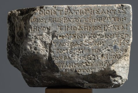 - griechisch : [οἱ στρατη]γοὶ οἱ στρατηγήσαντες / ποιοῦ Ἐπικράτου τὴν πρώτην / [τετράμ]ηνον Τιμόδημος Ἐκαταί/[ου Διο]νύ[σιος Δ]ιονυσίου τοῦ Διονυσο/[δώρου, Θαρσ]ύλος Θαρσύλου Ἀρισ/[τομένης Ἀρι]στομένου Πολύξενο/[ς Μήτρωνος Ἰ]σοκράτης Θευδίκου / [Θρασύδημος Θρα]συδήμου ὁ ἐξ Ἡρακ[λείδου] / [Ἡρακλείδης Διο]δότου Ἑ[ρμογένης] / [--- καὶ τῶι Δήμωι]