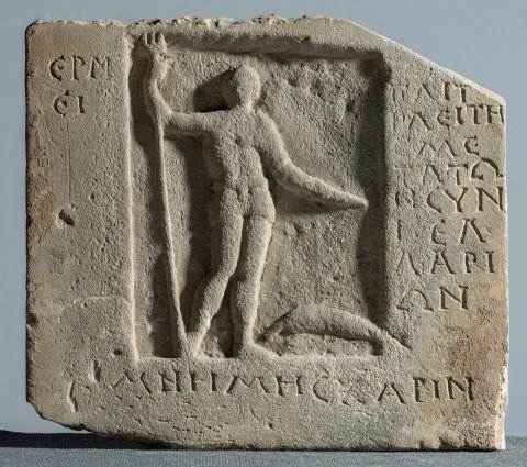 - griechisch: Ἑρμ/εῖ // Παιτ/ραείτη/ς με/τὰ τῶ/ν συν/κελ/λαρί/ων / μνήμης χάριν