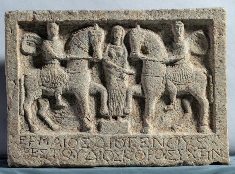 - Mythische Figuren: auf Podest stehende Göttin zwischen zwei Reitern (Dioskuren) in kurzer Tunica und wehendem Mantel (vgl. Donaureiter).