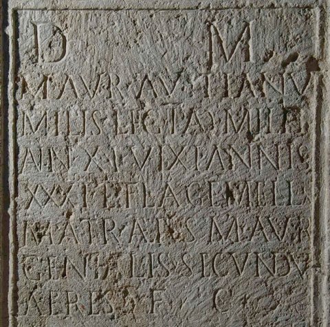 - D(is) M(anibus) / M(arcus) Aurelius Avitianus / miles leg(ionis) I Ad(iutricis) milit(avit) / ann(is) XI vixi(t) annis / d(e)f(unctus) in Part(h)ia / XXXI et Fla(via) Gemella / mater aeius(!) M(arcus) Aur(elius) / Genialis secundus heres f(aciendum) c(uravit)