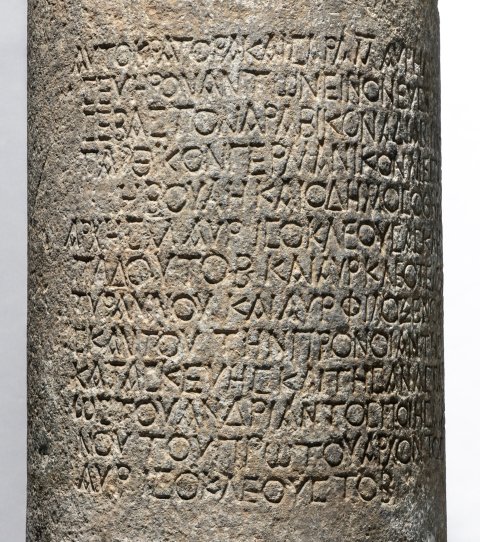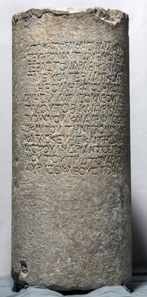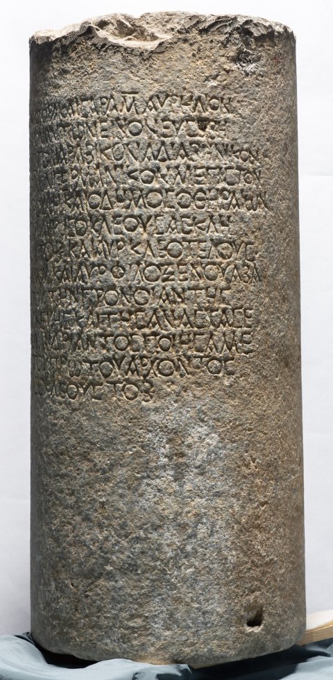 - griechisch: Αὐτοκράτορα Καίσαρα Μ(ᾶρκον) Αὐρήλιον / Σεβῆρον Ἀντωνεῖνον Εὐσεβῆ / Σεβαστὸν Ἀραβικὸν Ἀδιαβηνικὸν / Παρθικὸν Γερμανικὸν μέγιστον / ἡ βουλὴ καὶ ὁ δῆμος ὁ Θηραίων / ἀρχ[ῆ]ς Μ(άρκου) Αὐρ(ηλίου) Ἰσοκλέους / Ἀσκληπιάδου τὸ βʹ καὶ Αὐρ(ηλίου) / Κλεοτέλους Τυράννου καὶ Αὐρ(ηλίου) Φιλοξένου / Ἀβασκάντου, τὴν πρόνοιαν τῆς παρασκεβῆς / καὶ τῆς ἀναστάτεως τοῦ ἀνδριάντος ποιησαμένου / τοῦ πρώτου ἄρχοντος Αὐρ(ηλίου) Ἰσοκλέους τὸ βʹ
