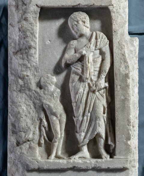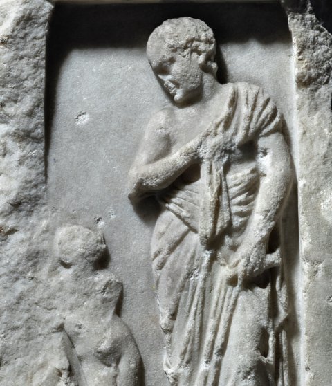 - Stele mit horizontalem Abschluss, oben porfiliert, rechteckige Nische zwischen Pilastern. Stehender Mann im Mantel, in der Linken Rolle (volumen), blickt auf einen zu seiner Rechten lehnenden nackten Knaben.