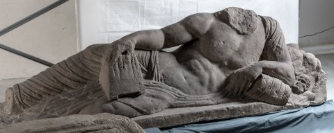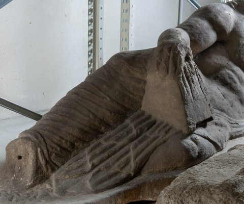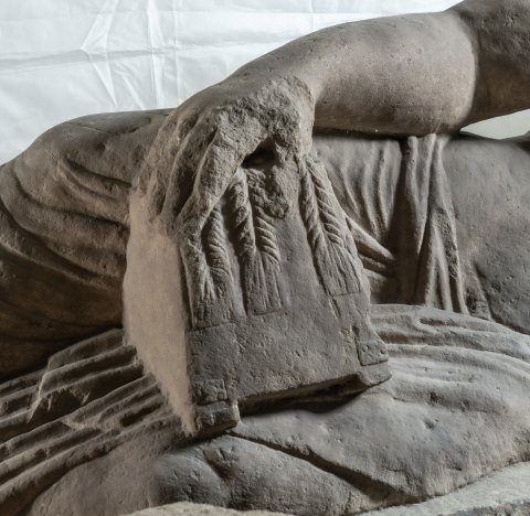 - Mythische Figur: auf den linken Arm gelagerter bärtiger Flussgott (Nil ?), Mantel um linke Schulter, Hüften und Beine, linker Arm liegt auf einem Fass, die rechte Hand auf einem Kästchen, aus dem Ähren hängen. Hinter dem linken Arm Felsgrund und von unten her auftauchender Oberkörper einer männlichen Figur mit Vollbart, Ärmeltunica und Mantel.