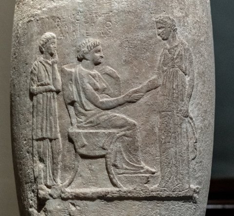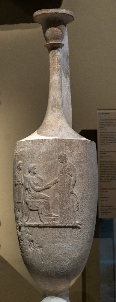 - Auf dem Gefäßkörper Standleiste mit Dreiergruppe: sitzende Frau, die einer vor ihr stehenden Frau die Hand reicht (Mutter und Tochter ?). Hinter dem Stuhl stehende Dienerin.