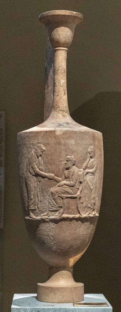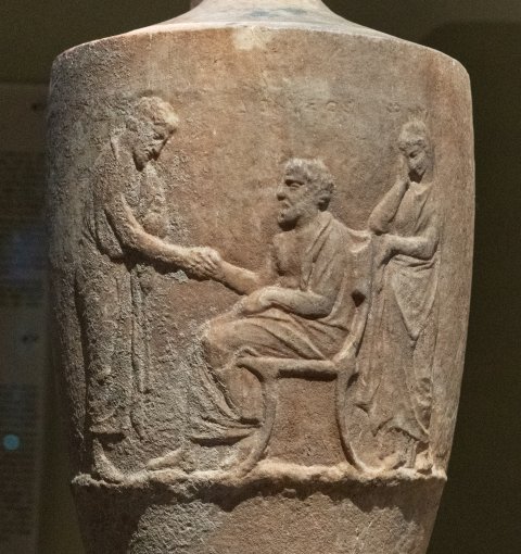- Auf dem Gefäßkörper Standleiste mit Dreiergruppe: sitzender bärtiger Mann im Mantel reicht einem vor ihm stehenden Mann die Hand. Hinter dem Stuhl stehende trauernde Frau.