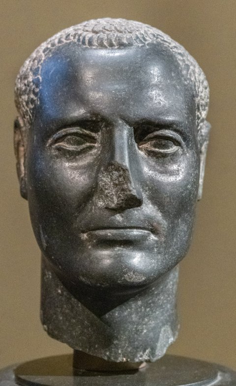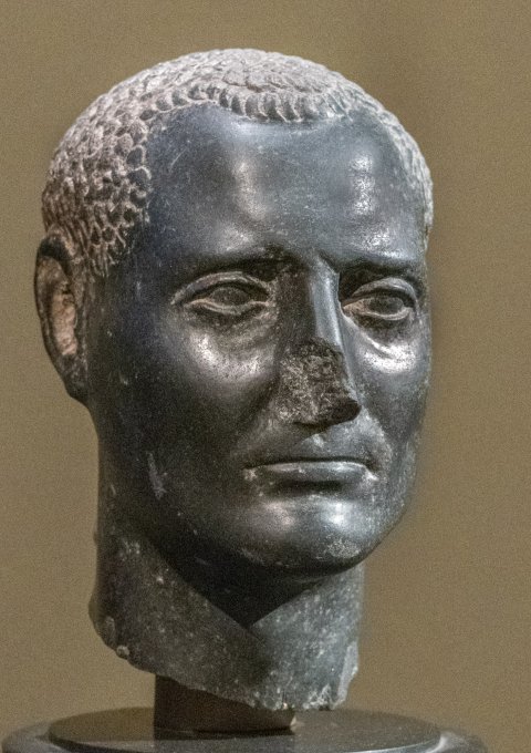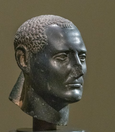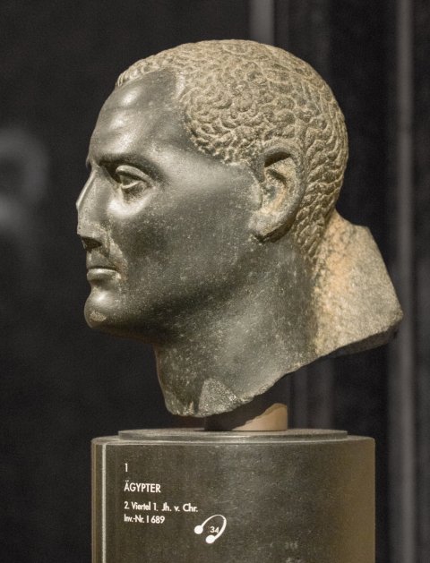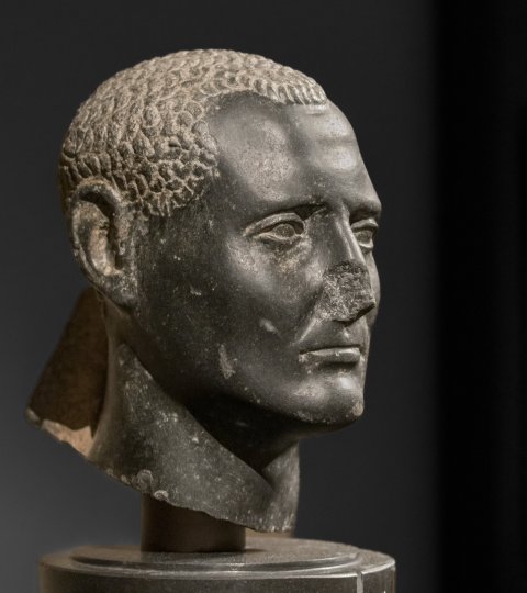 - Porträtkopf eines bärtigen Mannes mit kurz gelocktem Haar. Im Nacken Rest des Rückenpfeilers.