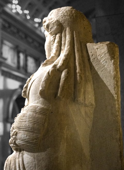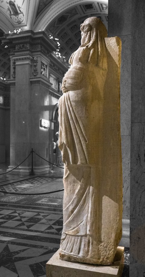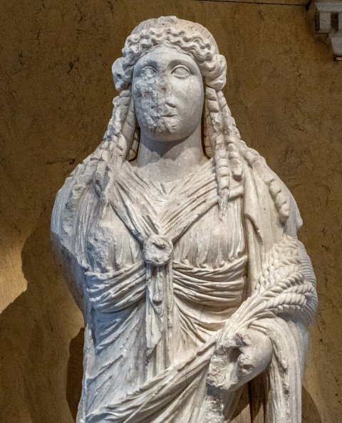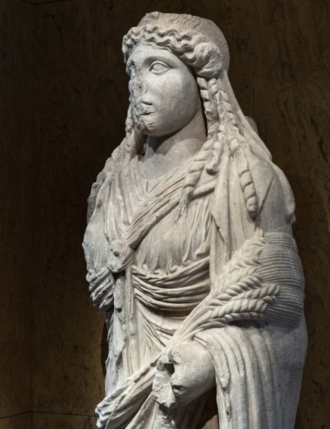 - Mythische Figur: Isis mit Isisknoten auf der Brust, im linken Arm Ähren. Rückenpfeiler. Römische Kopie, Original 4. Jh. v. Chr.