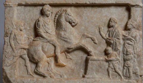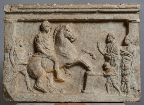 - Nach rechts reitender Heros, hinter ihm laufender Mann in kurzem Chiton und Mantel, Stock in der linken Hand. Rechts Altar und Verehrer: Ehepaar mit zwei Kindern (Mädchen in langem Chiton und Mantel, Knabe in kurzem Chiton mit Schale (?) in den Händen. Diener ?). Architektonischer Rahmen, oben Dach mit Antefixen, seitlich Pilaster.