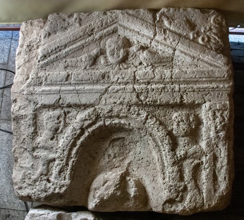 Im Hauptbild zwischen Pilastern Rundbogen, darunter Halbfigur eines Mannes in Toga (?). In den Zwickeln zwischen Bogen und Architrav Büsten von Windgöttern, darunter Delphine. - Kommentar
