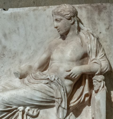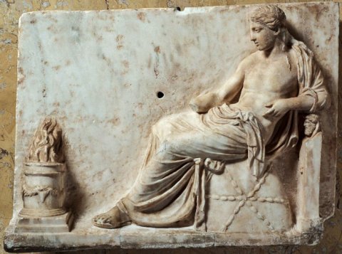 - Mythische Figur: auf dem Omphalos sitzender Apollo, linker Arm auf bärtige Herme gelehnt, vor ihm Rundaltar mit Girlanden an Bukranien, oben Flamme. Rahmenlose Platte mit Standleiste.