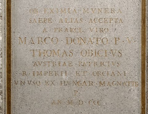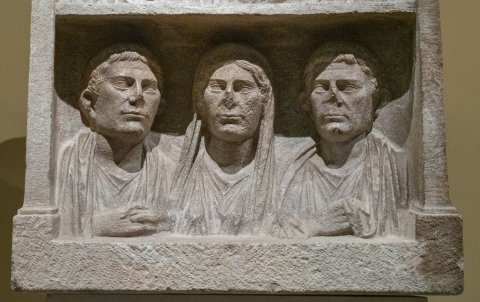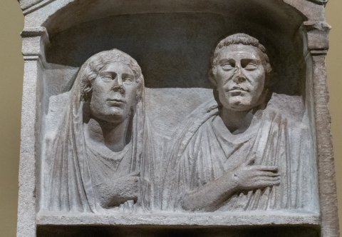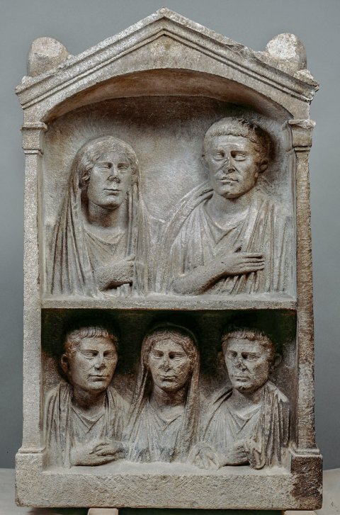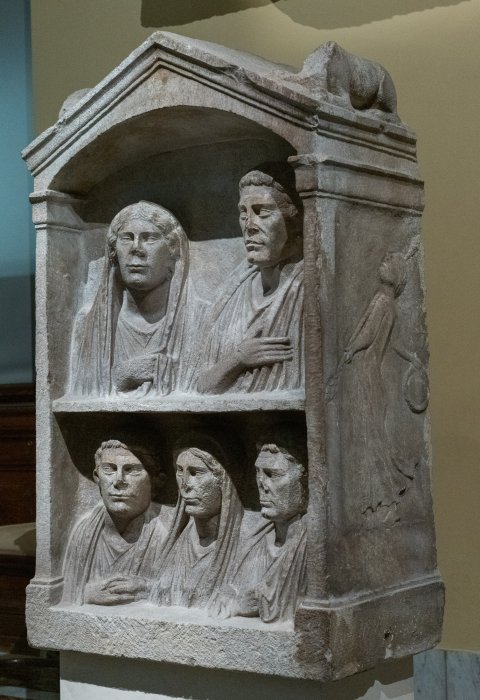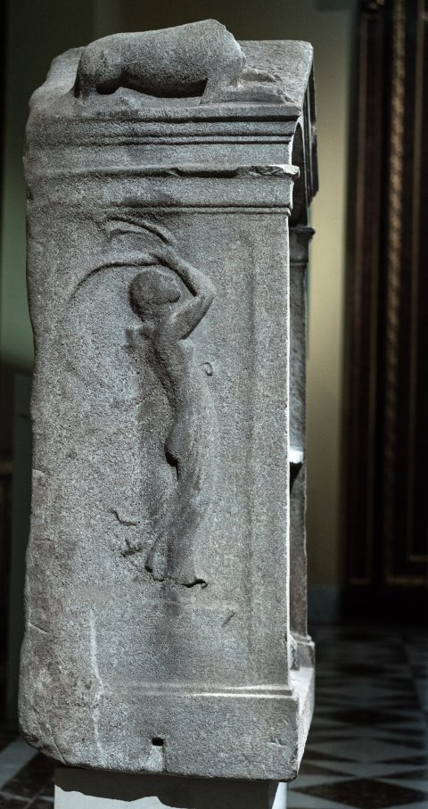 - Aedicula mit Giebel, auf den Dachseiten liegende Löwen. Bogennische zwischen Pilastern, zwei Register mit Brustbildern einer Familie. Oben Ehepaar: Frau mit über den Kopf gelegtem Mantel, bartloser Mann in Tunica und Toga. Unten drei Personen: Frau zwischen zwei bartlosen Männern (Mutter und Söhne ?). Auf den Nebenseiten je eine tanzende Mänade. Links mit Schleier, rechts mit Thyrsosstab und Tympanon.
