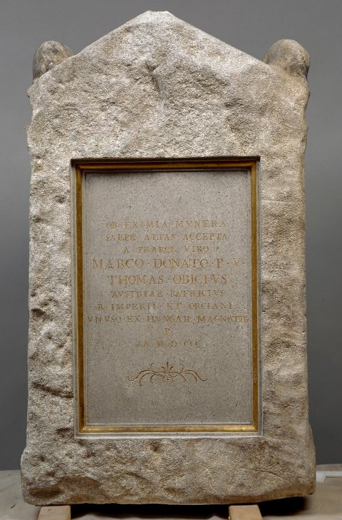 - bestoßen, Löwenköpfe abgebr., in den Nebenseiten unten je ein Klammerloch, auf der Rückseite moderne Inschrift