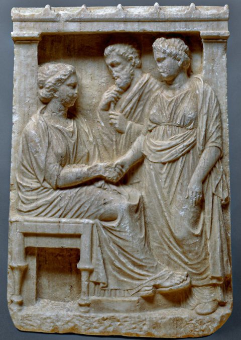 - Architektonischer Rahmen, oben Reihe von Antefixen, Architrav auf Pilastern. Nach rechts hin sitzendes Frau in Chiton und Mantel, die einer vor ihr stehenden Frau die Hand reicht. In der Mitte im Hintergrund stehender bärtiger Mann im Mantel, in beiden Händen Stock.