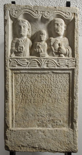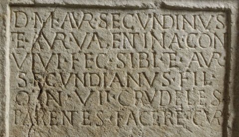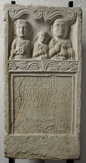 - D(is) M(anibus) Aur(elius) Secundinus / et Aur(elia) Valentina con(iux) / vivi fec(erunt) sibi et Aur(elius) / Secundianus fil(ius) / o(bitus) an(norum) VII crudeles / parentes facere cur(averunt)