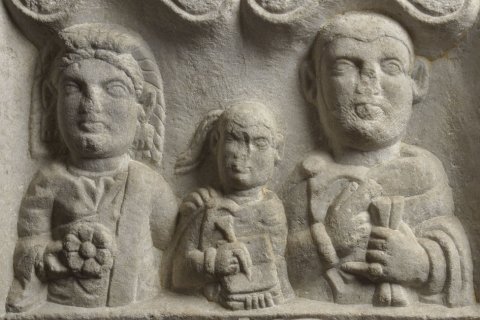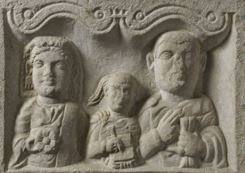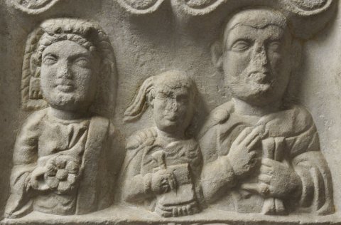 - Im Hauptbild Familie : unter Doppelbogen mit Volutenenden Brustbilder eines Ehepaares mit Kind. Links Frau: Schleier (?), Ärmeltunica, Mantel, Halsband, Ohrgehänge, in der Linken Blüte. In der Mitte Knabe: Horuslocke, Ärmeltunica, Sagum, in der Rechten Stilus, in der Linken Polyptychon: Rechts Mann: bärtig, kurzes Haar, Ärmeltunica, Sagum, in der Linken Rolle (volumen). Zwischenfries mit Efeuranken.