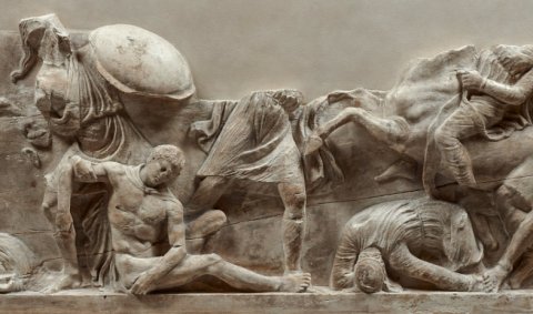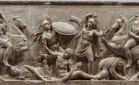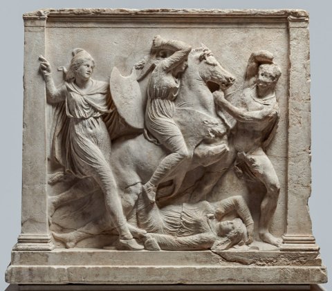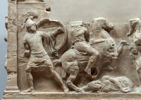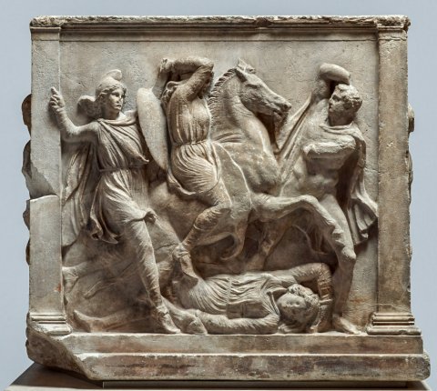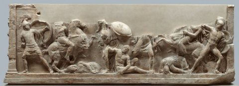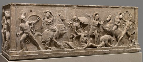 - Sarkophagkasten mit Eckpilastern. Reliefs auf allen vier Seiten. Mythos: Amazonomachie, Amazonen in Hosen und phrygischen Mützen, bewaffnet mit Doppelaxt und Peltenschild, zu Pferd und zu Fuß im Kampf mit nackten Kriegern mit Helm, Schild, Schwert.