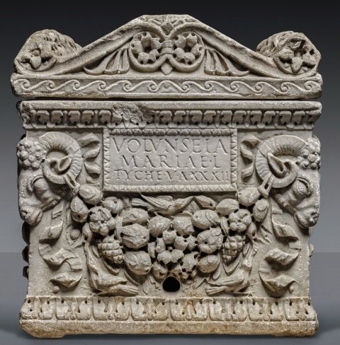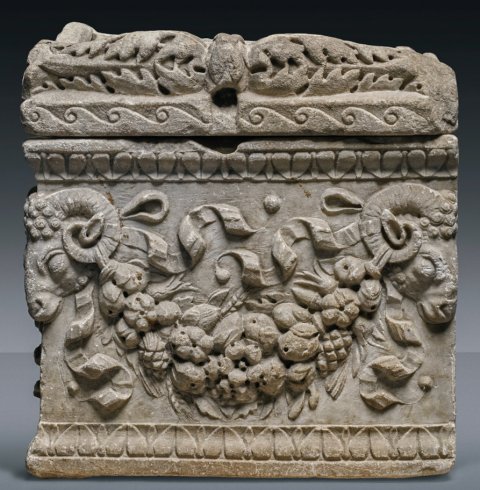 - Deckel mit geschnürten Blattpulvini, dazwischen auf der Vorderseite Spiralhken mit Rosetten und Halbpalmetten, am unteren Rand Fries mit laufendem Hund. Kasten mit Kymatia oben und unten, an den Ecken Widderköpfe, an denen auf Vorder- und Nebenseite Girlanden mit Taenien hängen. Auf der Vorderseite unter der Girlande zwei Vögel, im Girlandenbogen Schrifttafel.