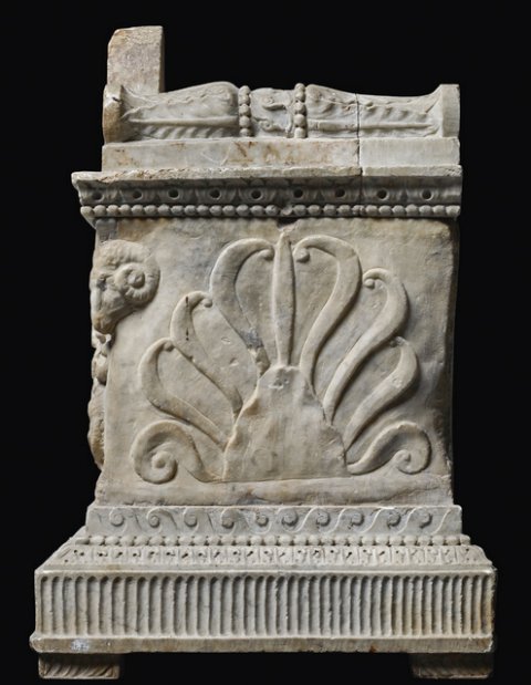 - Dachförmiger Deckel mit Blätterziegeln und geschnürten pulvini. Vorn Büste eines Kindes (Knabe) in Bogennische, neben der rechten Schulter liegender Hund. Auf der Vorderseite des Kastens an Widderköpfen aufgehängte , seitlich Vögel, im Girlandenbogen Adler, der auf den Flügeln die Schrifttafel trägt. Auf den Nebenseiten Palmette.